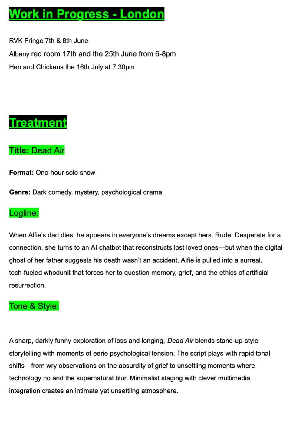 Not all of this will make it into the show. For example, when it came to submitting the blurbs for the programme, I didn’t want to define whether the death was supposed to have been an accident or natural, and changed the wording to be a bit more obscure and give me flexibility to write whatever I want.